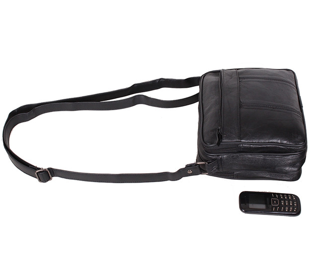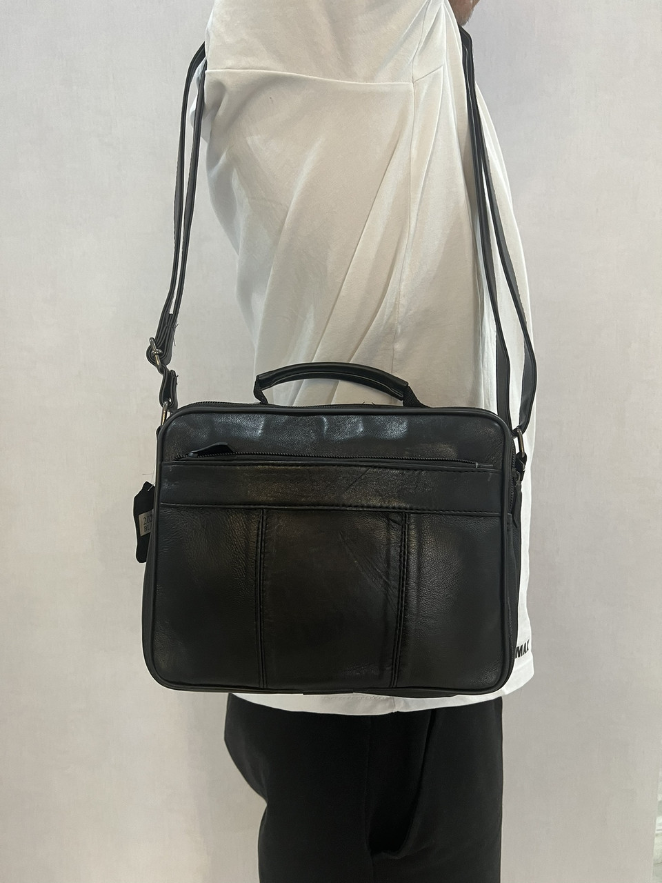 Сумка чорного кольору для носіння через плече або плече. Вся верхня частина цієї моделі на 100% складається з натуральної шкіри. Внутрішня підкладка виготовлена з текстильного матеріалу. Має більш ніж достатньо відділень, завдяки чому кишенькові речі будуть в ідеальному порядку та на своїх місцях. Оснащена ременем на плечі довжина якого регулюється. Є три головні відділення автономних між собою. В одному з них передбачена потайна кишенька на блискавці. Додатково кишеня на передній зовнішній і задній зовнішній стороні. Також сумка може бути корисним подарунком для чоловіка.